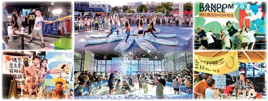 除了常见的市集摆摊,夜市更多的空间留给了运动和交友。夜市最“吸睛”的是演出舞台,被称为夏YEAH(谐音“夏夜”——记者住)舞台。从17时30分到22时,这里轮番上演各种小型演出和互动活动:迎亚运青春音乐节、随机舞蹈SHOW、街舞、桨板瑜伽……每个演出都有现场游客被邀请上台,一起体验。