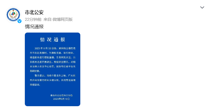 荔枝新闻讯 青岛市公安局市北分局官方微博8月18日消息,2023 年 8 月 16 日晚,某网络主播在我市市北区直播时,为赚取流量、吸引粉丝,编造剧本进行摆拍直播,引发网民关注。公安机关迅速开展调查,根据调查情况,对相关当事人依法予以处罚,其账号已被平台无限期封禁。