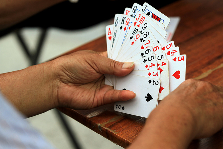 2023年8月6日,江苏淮安,一些老年市民在公园玩扑克“掼蛋”游戏。视觉中国 资料图
