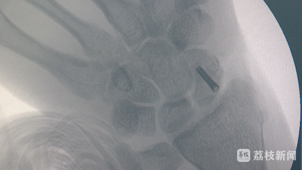 使用的"武器"是大家伙,练就的"武艺"却要极其精准。这位患者腕舟骨骨折,手术切口就在神经血管周围,医生需要小心谨慎,将一颗直径2.5毫米、长1.6厘米的螺钉,精准打入腕舟骨位置。而腕舟骨是一个远近端不规则的船形结构,最长直径不到3厘米。