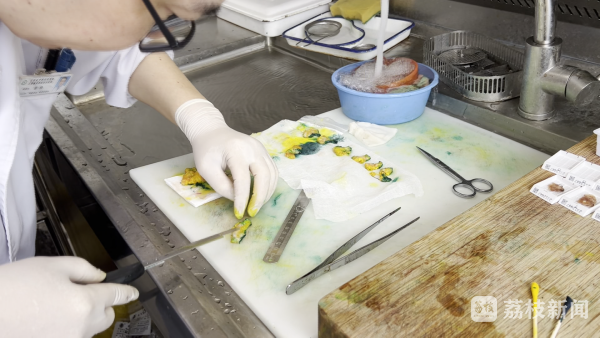 病灶是否恶性,需要经过切割、脱水、制成蜡块、切片等十多道工序,掌握这一切的,是病理科医生。初看病理科医生的工作间,有点像厨房。病理科副主任医师曾铮表示:“我们有一部分的装备和家庭的厨房用具是通用的,像家里切菜的砧板,在我们这里使用起来一样非常好。”