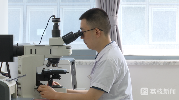 一个病理标本,从送检到出具报告,需要技师与医生默契配合。一名熟练的病理技师,可以将标本切成厚度约3微米的超薄切片,这个厚度相当于1毫米的三百分之一。接着,这张超薄切片会被送到显微镜下,交由病理医生来"研判"。放大40到400倍后,标本的细胞结构逐渐显现。