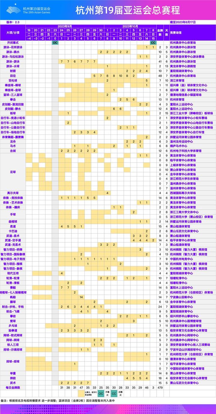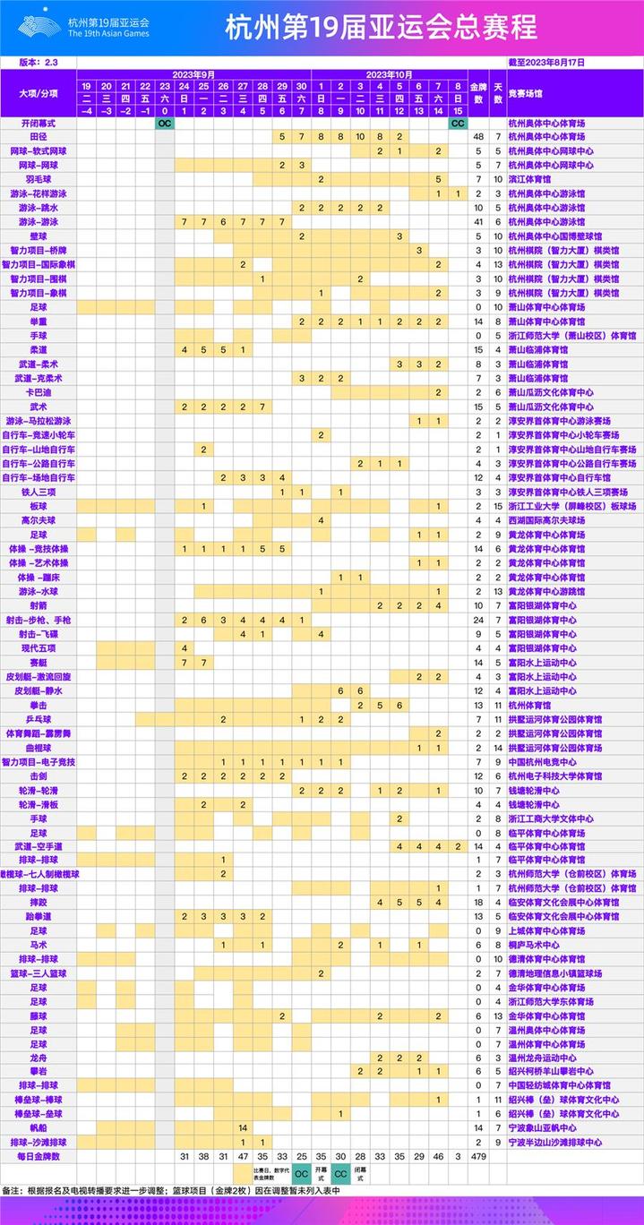 杭州亚运会总赛程2.3版(按场馆):