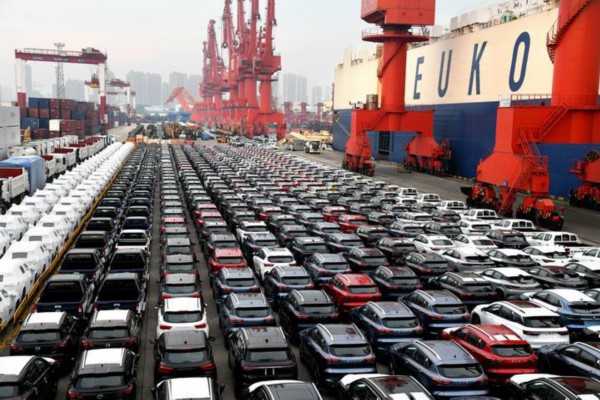 商品车在山东港口青岛港大港公司八号码头等候装船(2022年8月7日)。大型滚装货轮“晨声轮”靠泊山东港口青岛港大港公司八号码头,将各类逾1900辆商品车运往非洲。新华社记者 李紫恒 摄