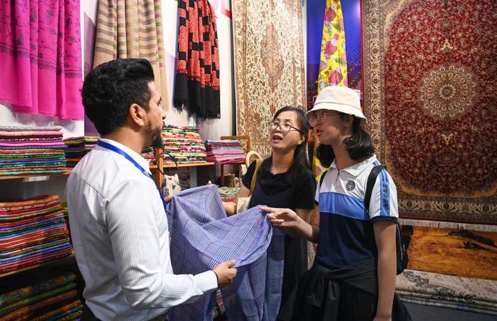 8月17日,参观者在交流合作馆尼泊尔展区了解特色商品。新华社记者 邹竞一 摄
