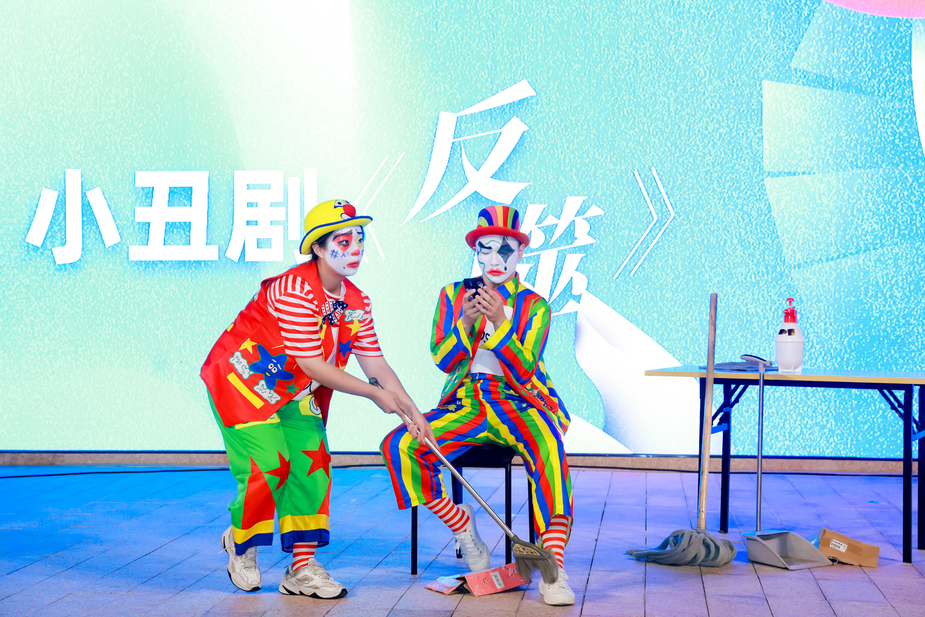 而南京晓庄学院的陈宇辰、张欣玥,则用丰富的肢体语言演绎了一出小丑轻喜剧《反噬》,在他们惟妙惟肖的表演中,老板与打工人的斗智斗勇笑果频出,现场掌声不断。
