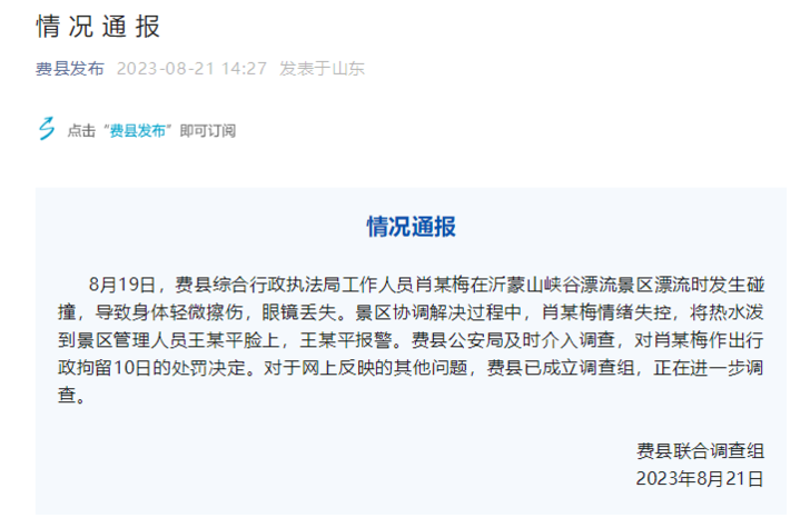 荔枝新闻讯 “费县发布”微信公众号消息,8月19日,山东费县综合行政执法局工作人员肖某梅在沂蒙山峡谷漂流景区漂流时发生碰撞,导致身体轻微擦伤,眼镜丢失。景区协调解决过程中,肖某梅情绪失控,将热水泼到景区管理人员王某平脸上,王某平报警。费县公安局及时介入调查,对肖某梅作出行政拘留10日的处罚决定。对于网上反映的其他问题,费县已成立调查组,正在进一步调查。