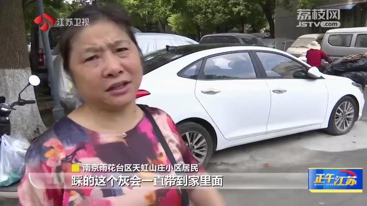 南京雨花台区天虹山庄小区居民说:“踩的这个灰会一直带到家里面,你看我们汽车上面都能写字,全是灰,我们车子上面一个疤一个疤的,都是水泥点。”
