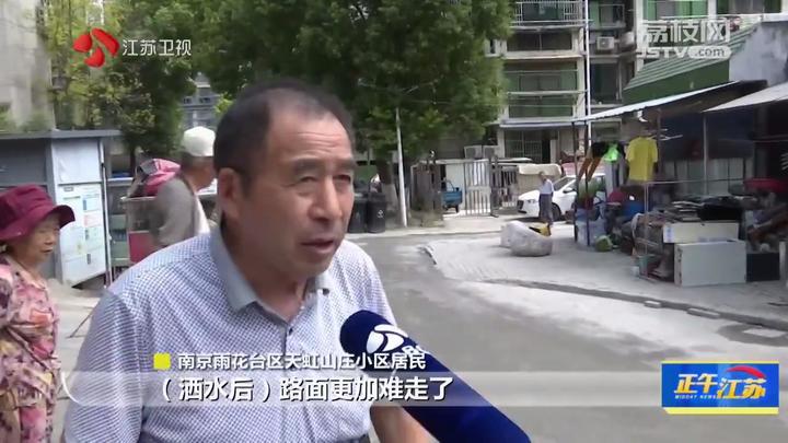 南京雨花台区天虹山庄小区居民说:“洒水后路面更加难走了,踩得家里面全是泥浆。”
