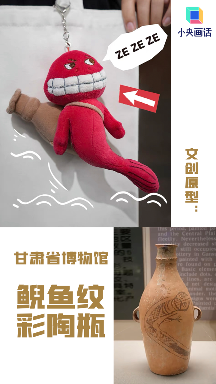 从甘肃省博物馆走出来的,还有鲵鱼纹彩陶瓶,瓶腹绘黑色人首形的鲵鱼图样,一双短臂向外伸出,全身为斜格纹,尾部弯曲。