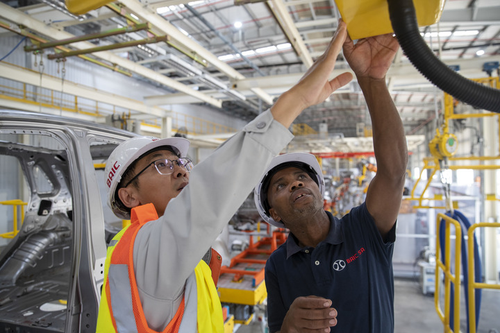 5月9日,在南非东开普省北汽南非工厂,当地员工邦加尼(右)与中国同事方龙在焊装车间内工作。