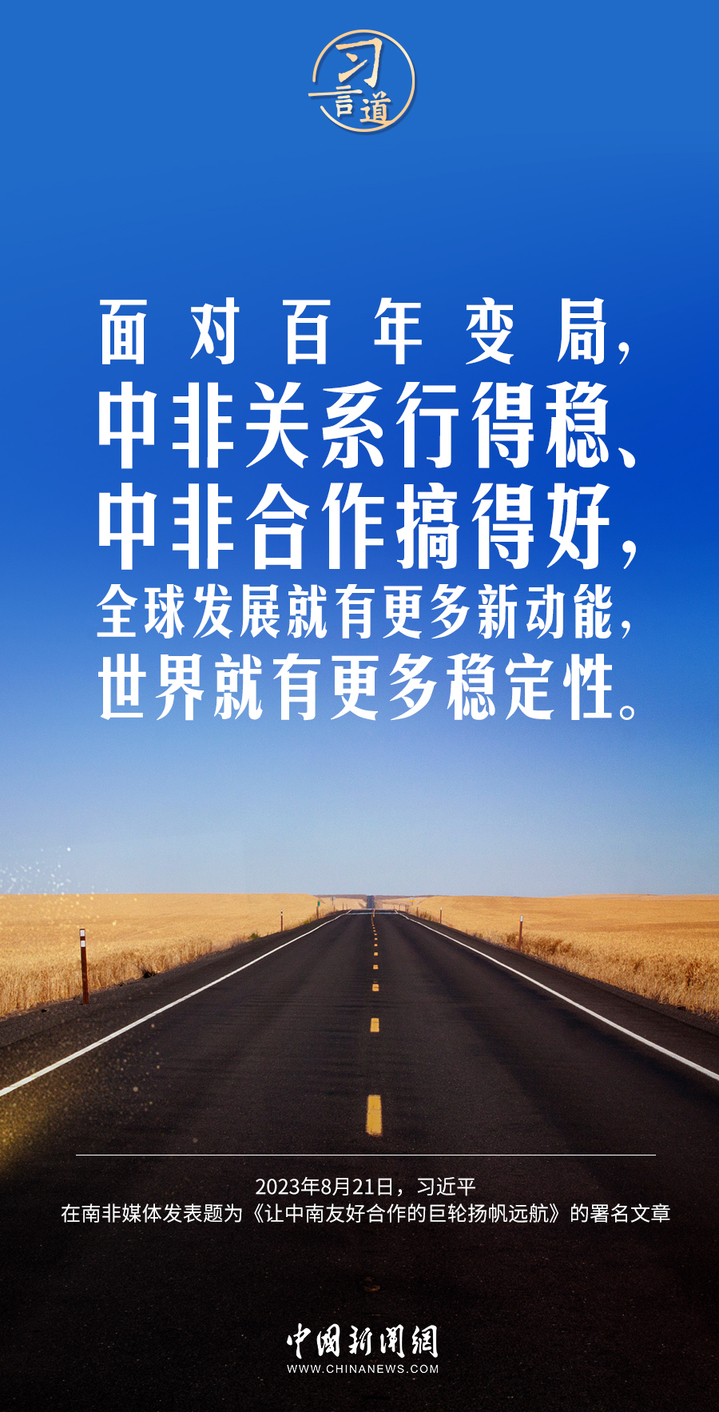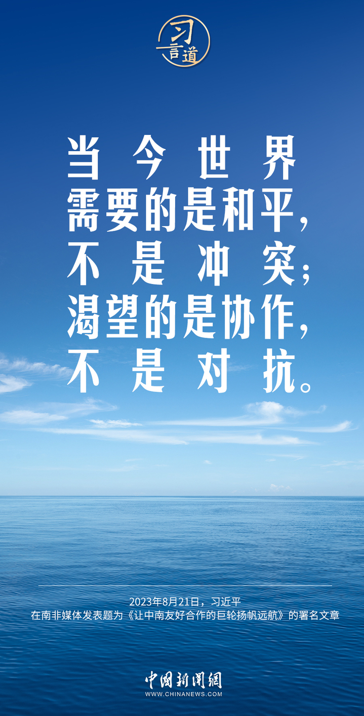 8月21日,在赴约翰内斯堡出席金砖国家领导人第十五次会晤并对南非进行国事访问之际,国家主席习近平在南非《星报》、《开普时报》、《水星报》和南非独立媒体网站发表题为《让中南友好合作的巨轮扬帆远航》的署名文章。习近平指出——