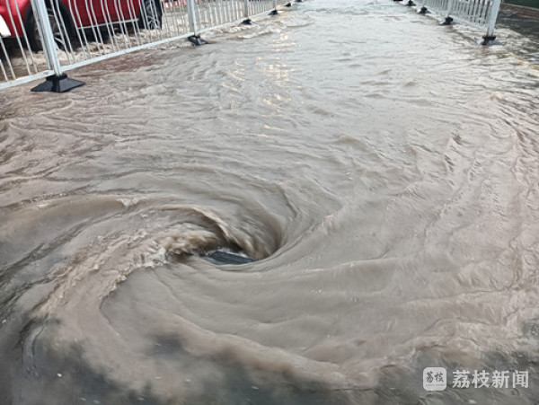 交警 “以雨为令、闻雨即动”,迅速启动应急预案,冒雨执勤,坚守岗位,保障市民出行平安,适时采取临时交通管制,消除交通安全隐患。社区医院附近,快车道上快水沟盖下沉,巨大水流涌向此处,形成巨大漩涡。