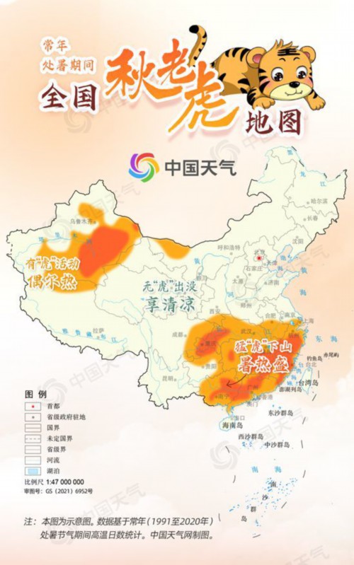 从中国天气网推出的全国秋老虎地图可以看出,常年处暑期间,南方大部还不能真正告别暑热,江南、华南等地高温天气较为常见,秋老虎不时出没。其中,重庆、浙江中南部、福建、江西、广东、广西等地是南方高温最频繁出现的地区,平均高温日数可以达到3至6天,秋老虎势头正猛。