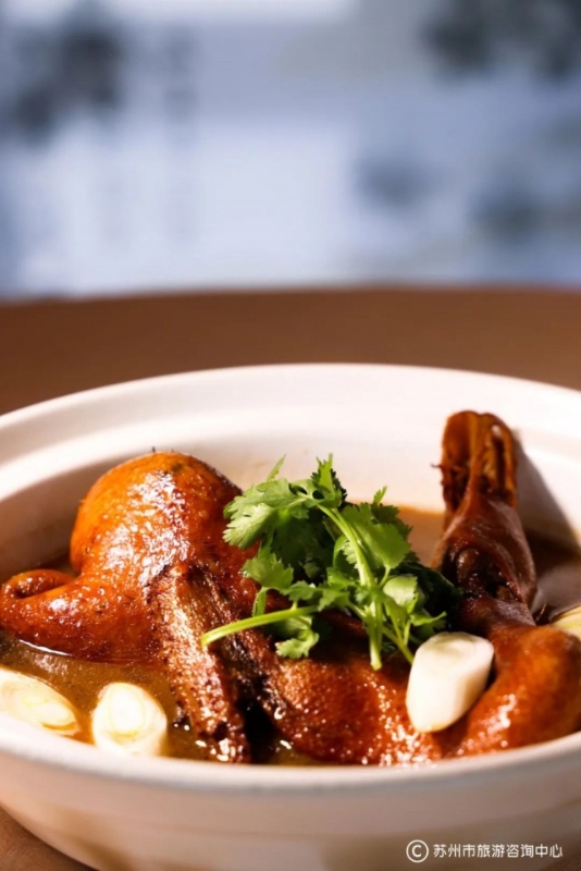 苏州人烹饪鸭子的方式很多,最常见、最受欢迎的还得是苏式酱鸭。表皮红亮、入口微甜,每一块鸭肉都在卤水中吸满了卤汁,滋味浓郁鲜美。