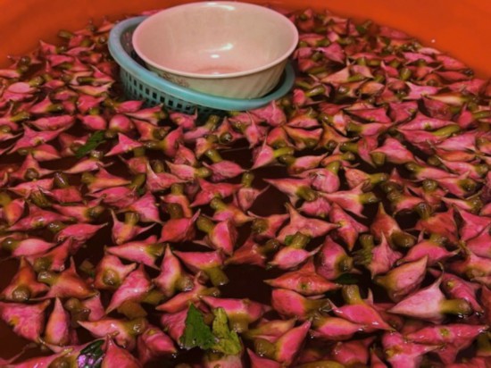 苏州的菱角品种很多,最有名的便是有着“苏州红”之称的水红菱。水红菱壳软薄而水份多,肉质细嫩,清香甘甜,可生吃,也可炒菜。