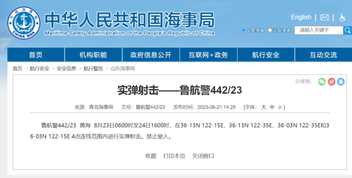 据中国海事局网站消息,青岛海事局发布航行警告, 8月23日6时至24日16时,黄海部分海域进行实弹射击,禁止驶入。