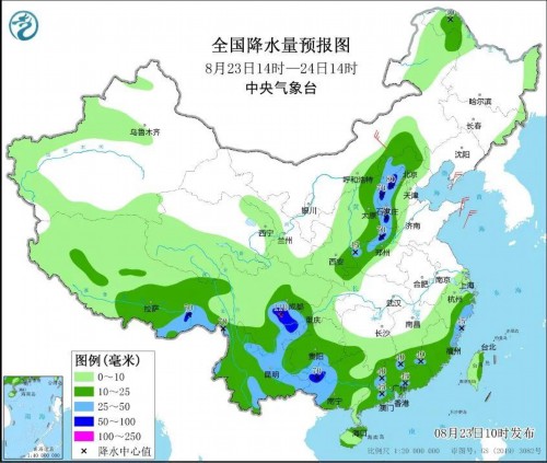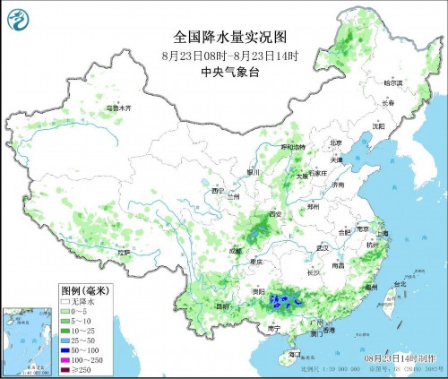 监测显示,8月23日8时至14时,四川东部、广西北部出现暴雨,广西北部局地大暴雨,广东、湖南、江西、福建、浙江等地也出现分散性暴雨。