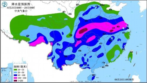 预计8月25日至28日,四川盆地中东部、西北地区东部、黄淮南部、江汉、江淮、江南北部等地将自西向东将出现一次强降雨过程。25至26日,强降雨主要出现在四川东部、重庆、陕西中南部、河南中西部、湖北西部;27日至28日,强降雨出现在河南南部、湖北中东部、湖南北部、安徽、江苏及西藏东南部;上述地区有大到暴雨,其中四川东北部、陕西南部、重庆北部、河南南部、湖北西部和北部、湖南西北部、安徽中南部、江苏中南部等地的部分地区有大暴雨(累计降雨量100至250毫米,局地超过300毫米);最大小时雨量有30至50毫米,局地60毫米以上,并伴有雷暴大风。此次过程累计降雨量100毫米以上覆盖范围约47万平方公里。