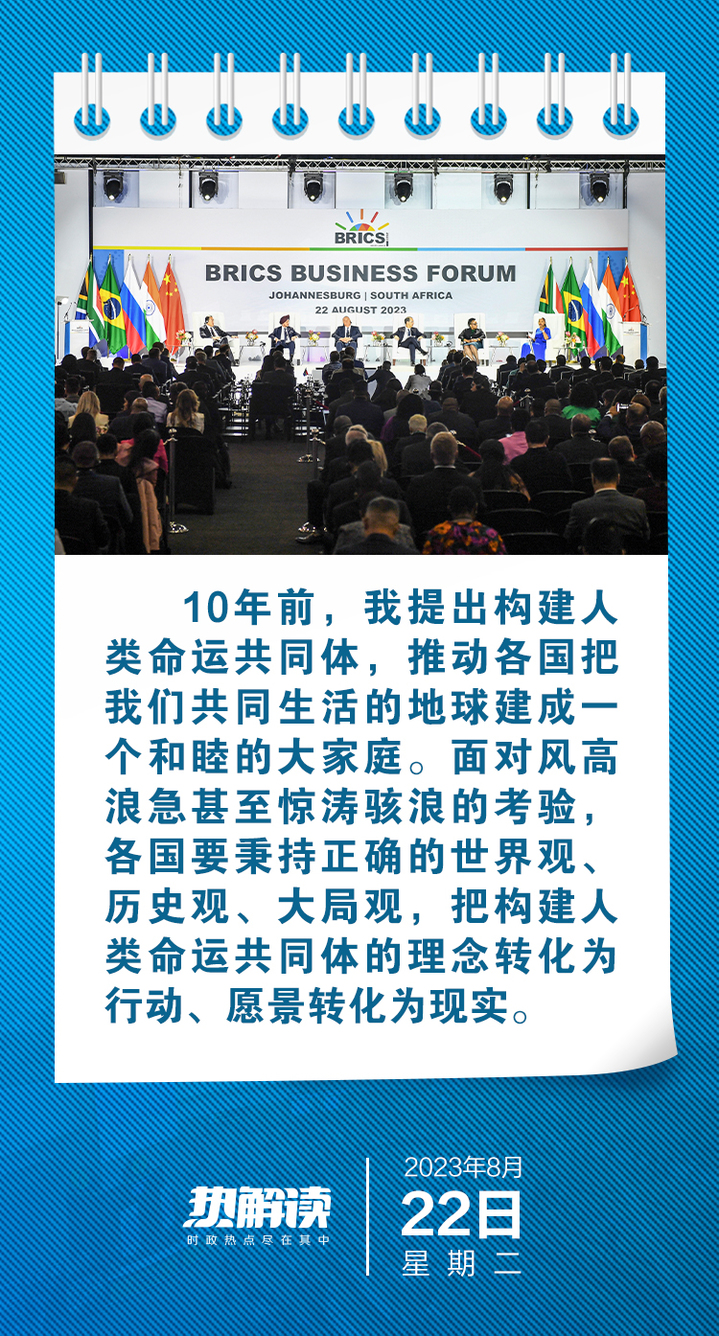 “历史的钟摆朝向何方,取决于我们的抉择。”8月22日,习近平主席向约翰内斯堡金砖国家工商论坛闭幕式发表致辞时,再次呼吁以“三大全球倡议”协同构建人类命运共同体。