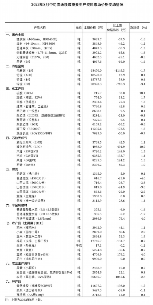 国家统计局今天发布数据显示,据对全国流通领域9大类50种重要生产资料市场价格的监测,8月中旬与8月上旬相比,共有25种产品价格上涨,23种价格下降,2种价格持平。