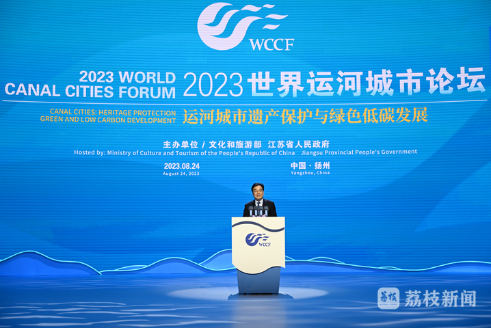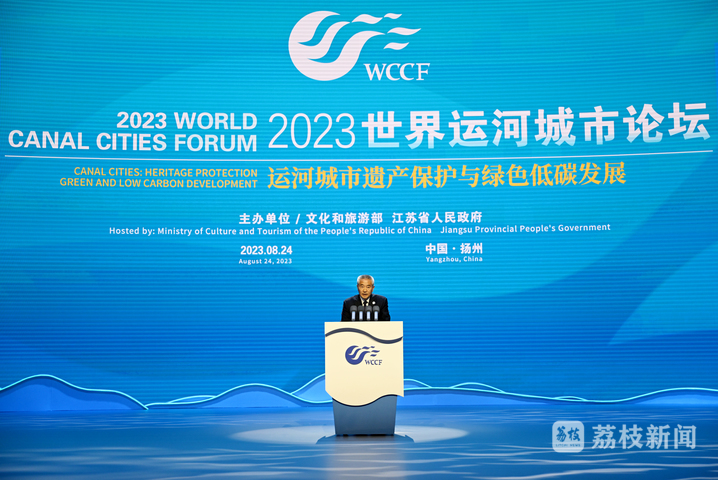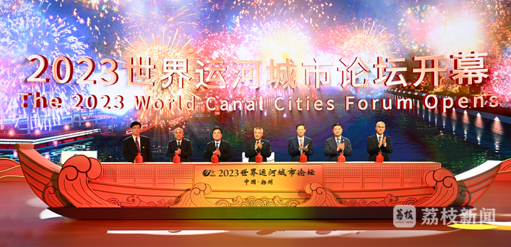 与会领导共同启动2023世界运河城市论坛。开幕式后,举行了主旨演讲,通过了《世界运河城市遗产保护与绿色低碳发展扬州倡议》。
