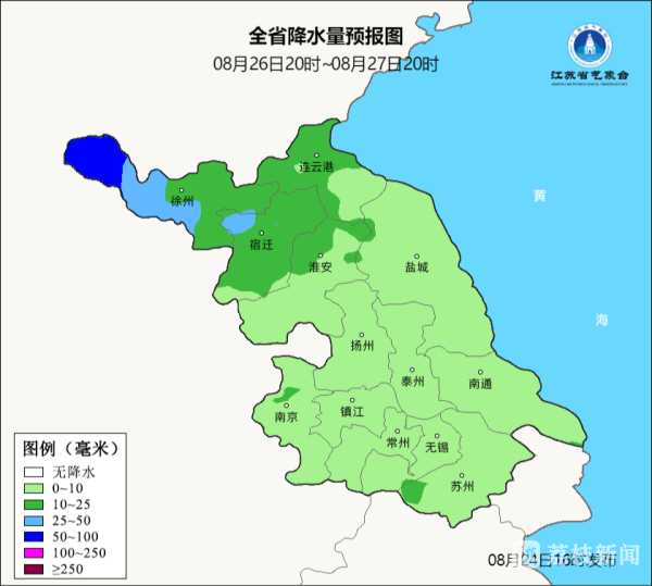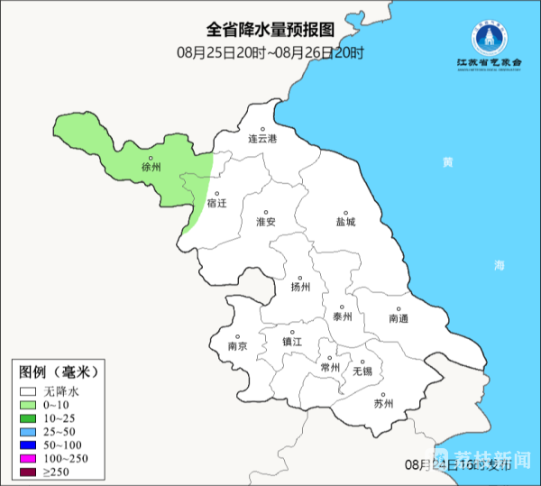 8月24日20时至8月25日20时,全省多云。最高温度:全省32℃左右;最低温度:苏南地区22~23℃,其他地区21℃左右。全省东到东北风3-4级。