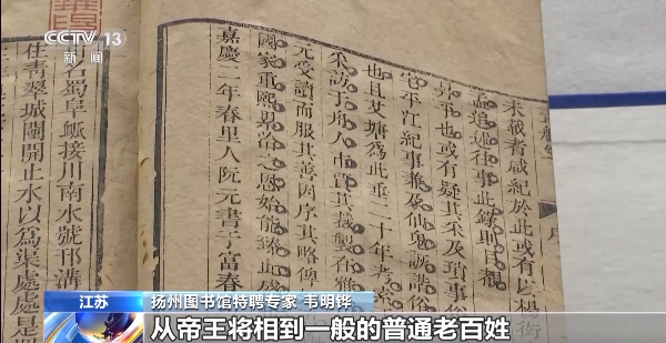 扬州图书馆特聘专家 韦明铧:它既写到乾隆皇帝的南巡这样的大的事情,也可以看到小东门桥旁边黄鳝店里面的黄鳝面它是怎么做出来的。我们认为这本书它的历史观是很超前的,从帝王将相到一般的普通老百姓,他都加以客观描述。