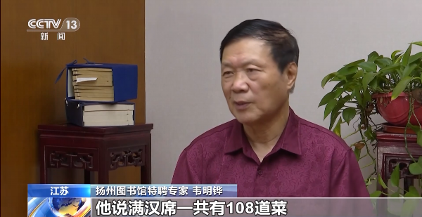 扬州图书馆特聘专家 韦明铧:他说“满汉席”一共有108道菜,那么108道菜是分5次来上菜的。第一次是放哪些炒菜、哪些汤菜、哪些甜食,然后这批菜要拿下去,第二批又有哪些菜,把菜的名称都一一地讲出来,然后第三批、第四次、第五批。早晨八九点钟开始我们要上很多的菜,然后吃到快10点、11点的时候,我们就离开宴席了,然后休息一下,然后到下午3点多钟我们再来吃第二次,把第二批菜再上来。这样我们要把108道菜吃完的话,我们需要三天的时间。