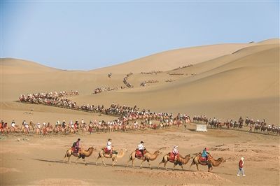 近日,甘肃省敦煌市碧空如洗,鸣沙山月牙泉景区景色如画,引人入胜。图为游客在月牙泉景区游览。 新华社发(张晓亮 摄)