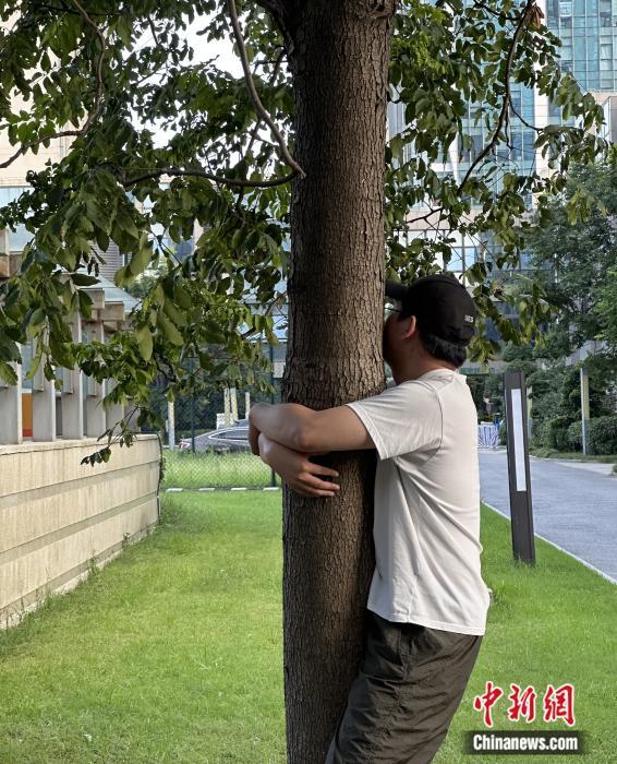 “95后”周先生近期开始尝试通过“抱树”缓解压力。谢梦圆 摄