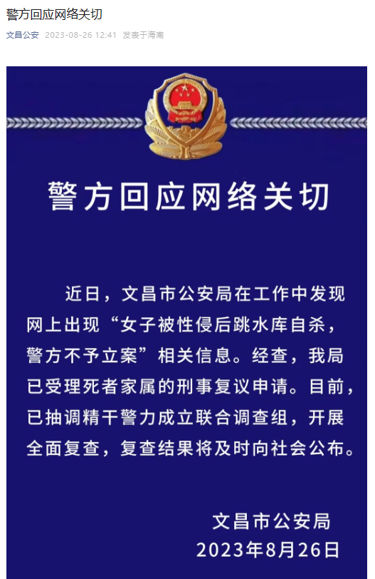 荔枝新闻讯 “文昌公安”微信公众号8月26日消息,近日,海南文昌市公安局在工作中发现网上出现“女子被性侵后跳水库自杀,警方不予立案”相关信息。经查,我局已受理死者家属的刑事复议申请。目前,已抽调精干警力成立联合调查组,开展全面复查,复查结果将及时向社会公布。