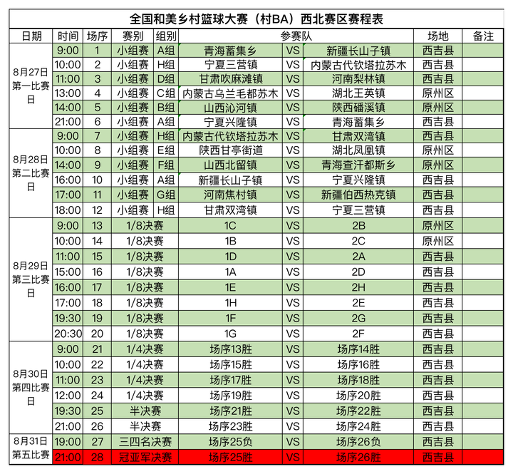 2023年8月27日,全国和美乡村篮球大赛(村BA)西北赛区的比赛即将在宁夏固原市西吉县吉强镇团结村篮球公园和宁夏固原市原州区中河乡中河村励志篮球俱乐部进行,来自山西、内蒙古、河南、湖北、陕西、甘肃、新疆、青海、宁夏9省区的18支代表队将开始激烈角逐,前两名参加全国总决赛。