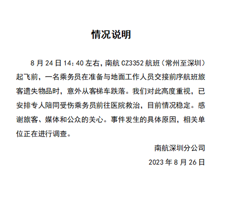 荔枝新闻讯 8月26日,南航深圳分公司发布《情况说明》: