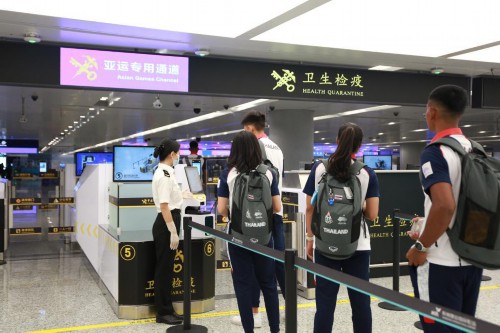 来自泰国亚运代表团的参赛运动员经过卫生检疫一体化智能闸机。(新华社发 周雨亮摄)