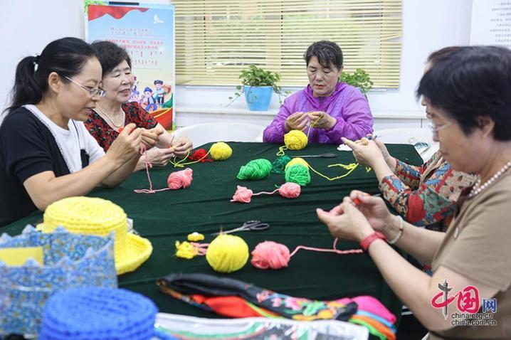 在临潢家园社区便民服务中心内,各族居民制作手工编织艺术品。中国网记者 伦晓璇 摄