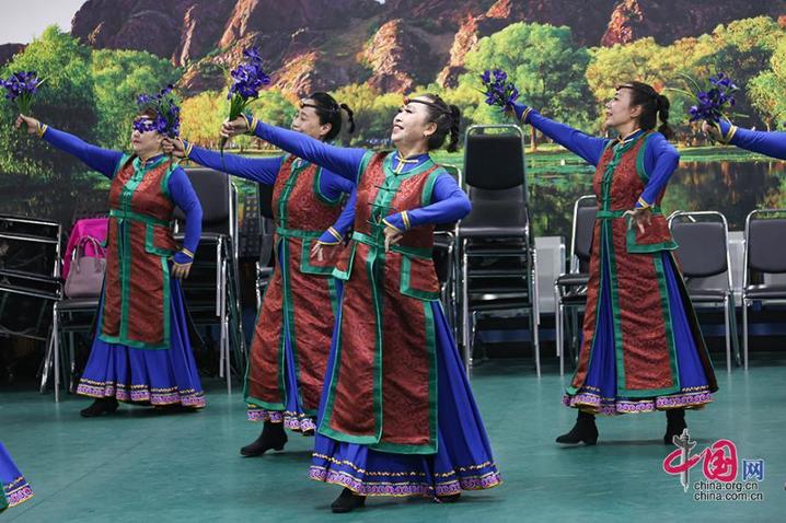 在临潢家园社区便民服务中心内,由社区里各民族居民组成的乌兰牧骑小分队正在排练厅内练习舞蹈。中国网记者 伦晓璇 摄