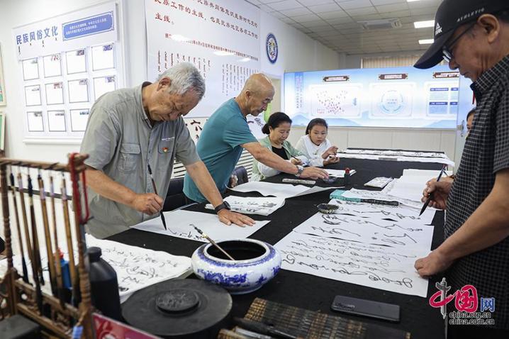 在临潢家园社区便民服务中心内,居民们正在练习书法。中国网记者 伦晓璇 摄