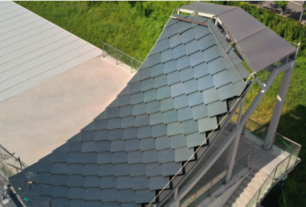 张瑞宜所说的龙鳞状屋顶瓦片,其实是一块块太阳能光伏板。在这些“龙鳞”的表面设计有独特的纹理,这是带有独特高分子材料涂层的钢化玻璃,里面添加钙钛矿量子点,可提升发电效率,并可防眩光。光伏板之间的连接点采用三向变轴调节支座,不仅使得“龙鳞”光伏板与建筑屋顶完美结合,而且屋顶整体呈现出的曲面,可以在各个角度迎合日光照射生产电力,并提供遮罩,有助于调节室内气温、湿度。