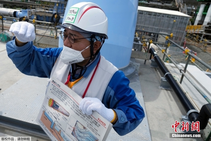 图为东京电力公司官员介绍提取经稀释处理的放射性废水样本的设施,该设施用于在排放前进行测试。