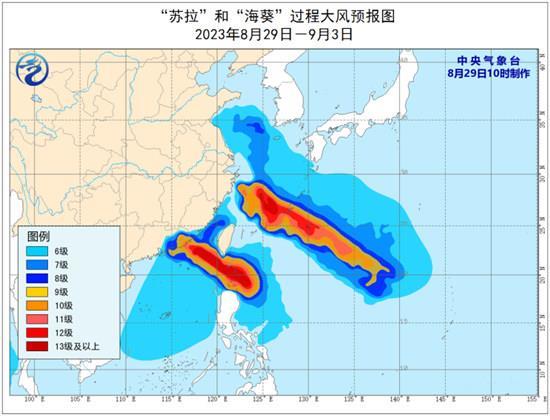 →大风预报:8月29日至9月3日,受台风“苏拉”和“海葵”影响,黄海南部、东海、台湾海峡、巴士海峡、南海大部、福建沿海、广东中东部沿海、台湾南部沿海将有6~8级、阵风9~10级的大风,东海南部、巴士海峡、南海东北部、广东中东部沿海风力达9~10级,部分海域或地区的风力可达11~13级、阵风14~15级,台风中心经过的附近海面风力有14~16级、阵风17级。