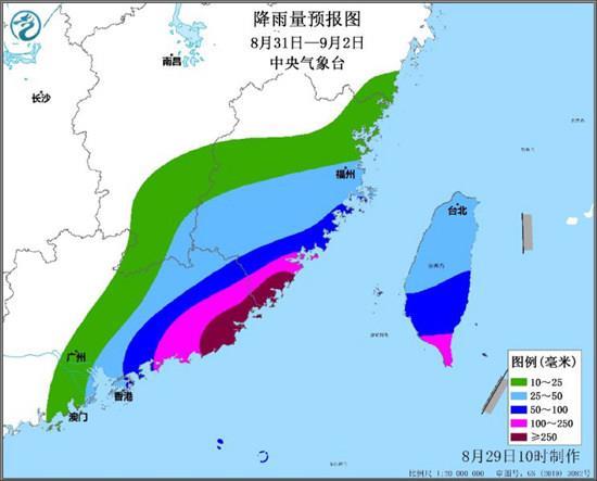 →降雨预报:受台风“苏拉”和南下冷空气共同影响,8月31日至9月2日,福建中南部、广东中东部、台湾有大到暴雨,福建东南部、广东东南部有大暴雨,沿海局地有特大暴雨(累计降雨量150~200毫米,沿海局地可达400毫米),最大小时降雨量40~80毫米。