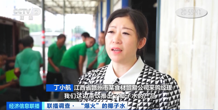 江西省赣州市某食材贸易公司采购经理 丁小航:我们的茶饮推出了椰子水的产品,一下子爆火,现在市场供不应求。所以我到现场来抢货了。