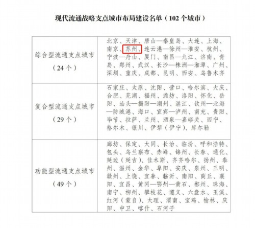 《通知》坚持系统思维和全局观念,突出国家所需和城市所长,按照服务重要商品和资源要素流通、强化跨域跨界辐射带动、促进现代流通发展等三个维度布局流通支点城市。综合考虑城市资源禀赋、发展基础、比较优势、未来潜力,将102个城市纳入布局建设范围,覆盖全国31个省区市以及新疆生产建设兵团。流通支点城市将按综合型、复合型、功能型分类推进建设,城市人民政府发挥主体作用部署推进,努力提升自身发展水平,增强辐射带动作用。苏州入选为全国24个综合型流通支点城市之一。