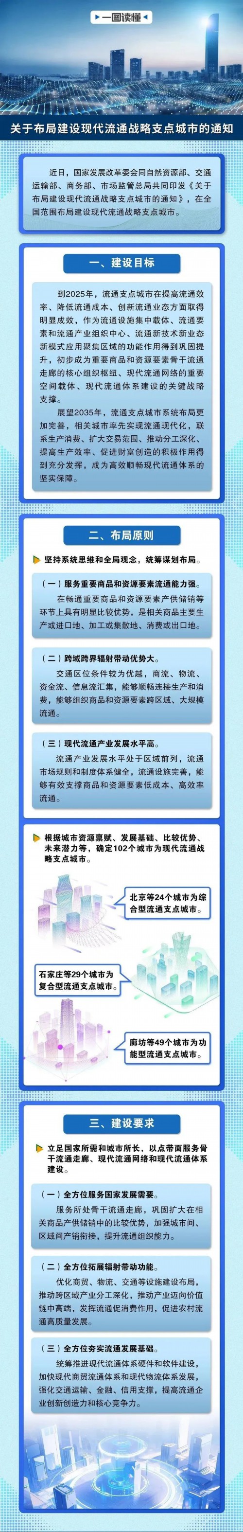 为贯彻党的二十大报告有关部署、落实《“十四五”现代流通体系建设规划》相关要求,推动构建高效顺畅的现代流通体系,近日,国家发展改革委会同自然资源部、交通运输部、商务部、市场监管总局印发《关于布局建设现代流通战略支点城市的通知》,部署现代流通战略支点城市布局建设工作。