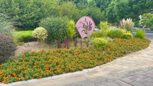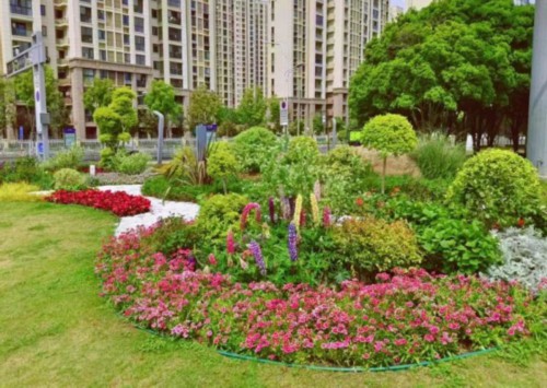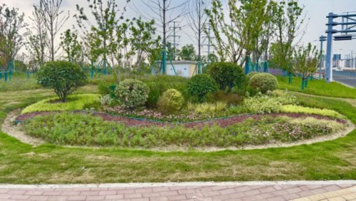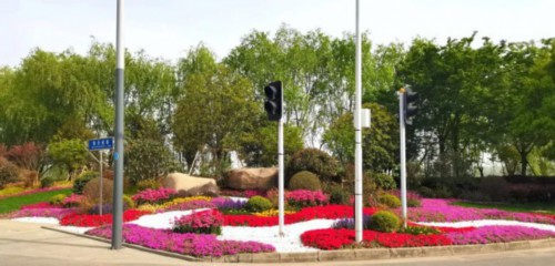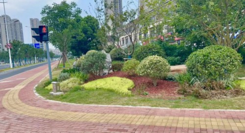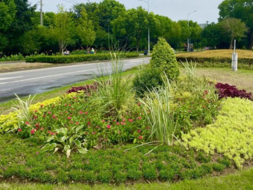 广济路与聚峰路路口,增加花镜组合,采用银姬小蜡球、龟甲冬青球、细叶芒、斑叶芒、佛甲草、红黄矾根、玉簪等,保证景观效果。