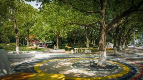 星都小游园,占地约7700m2,位于苏州工业园区星都街西侧,改造时通过重新梳理调整入口苗木的品种和位置,增加地面铺装主题图案以及色彩鲜艳的LOGO标识,提高游园入口的辨识度和临街界面的美观性,通过在林荫空间下增加环状花坛座凳、C形户外吧桌和波浪形彩虹座凳等休憩设施,“活化”了林荫场地,构筑出“老青幼友好型”共享空间,丰富周边居民的活动体验感。