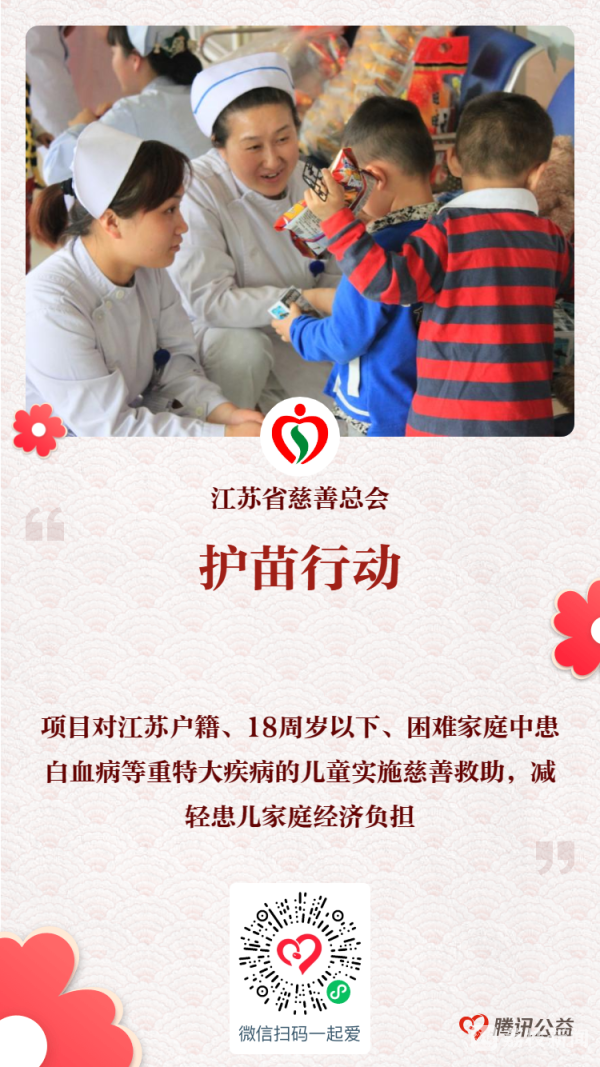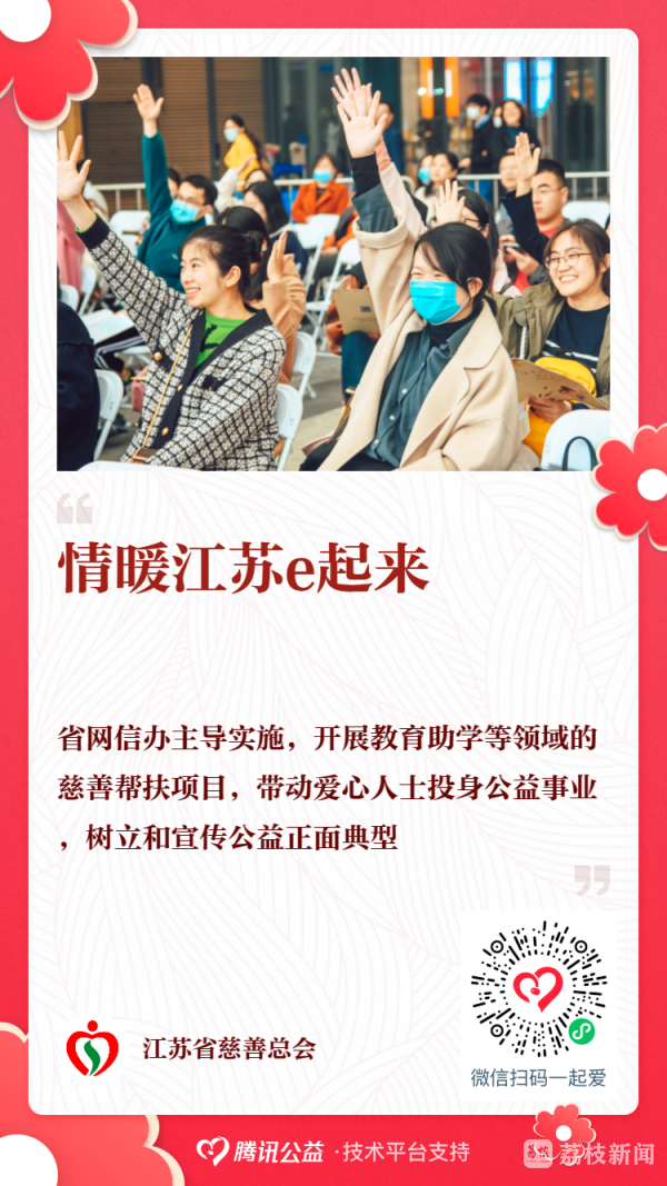 扫描下方海报二维码,即可进行捐赠。在“江苏慈善专场”(8月29日-8月31日)上午9:00和“99公益日”(9月7日-9月9日)上午10:00以后进行捐赠,还将有机会获得腾讯基金会公益配捐,放大爱心效应。赠人玫瑰,手留余香,大爱无言,善举无价,让我们一起用无私大爱为困难群众撑起美好未来!