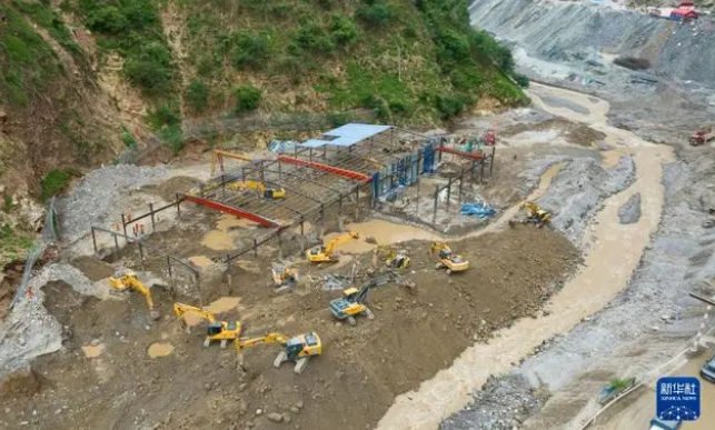 8月30日,救援人员在位于金阳县境内芦稿林河下游的蜀道集团沿江高速JN1(金宁一)标段项目部钢筋加工场民工驻地附近实施救援(无人机照片)。 新华社 图