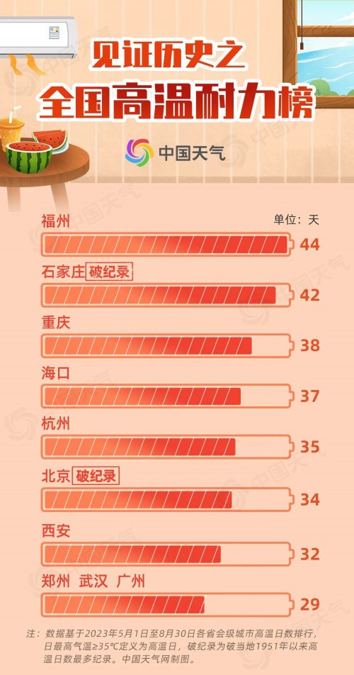 从中国天气网发布的高温耐力榜中可以看出,福州高温日数达44天,位居榜首,石家庄紧随其后,有“火炉”之称的重庆排在第三位,海口、杭州、北京、西安、郑州、武汉、广州均进入排行榜前十。